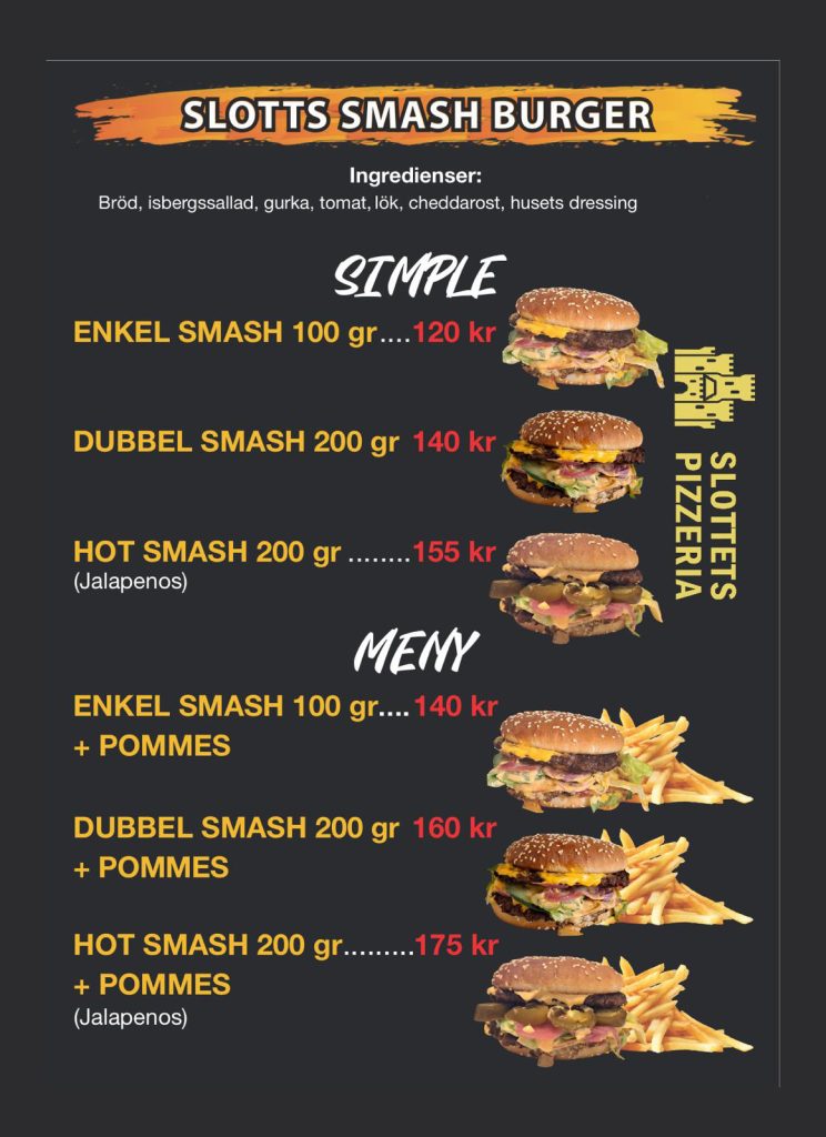 Alla hamburgare innehåller hamburgerdressing, lök, isbergssallad, gurka & färska tomater!